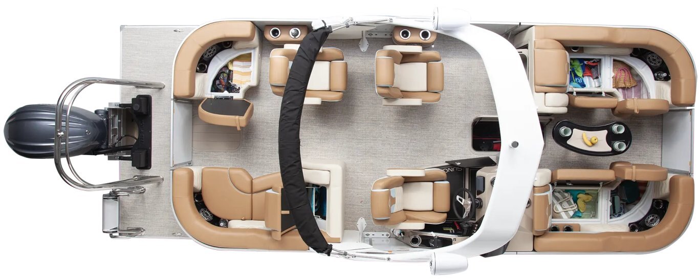 The SunCatcher Elite SR introduces a new layout for model year 2026, featuring an additional stern passenger helm seat. This smart addition transforms the stern into a comfortable hangout, perfect for relaxing with friends in your favorite cove.