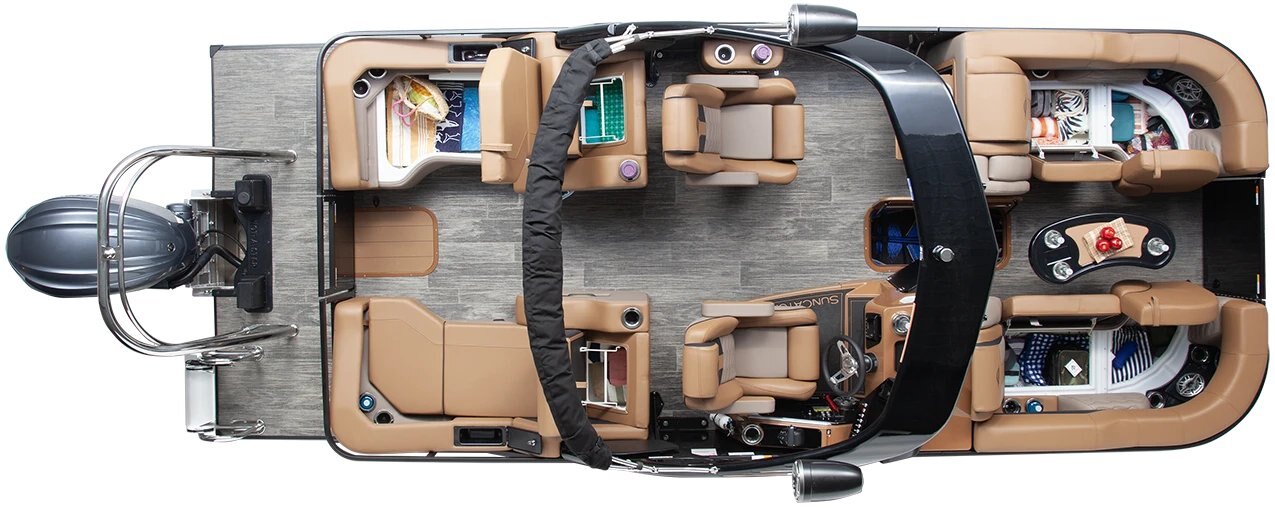 The SunCatcher Elite SS models feature gracefully styled lay-down couches designed for relaxation and convenience. With storage compartments, cup holders, and a handy amenity space within reach, comfort comes standard.